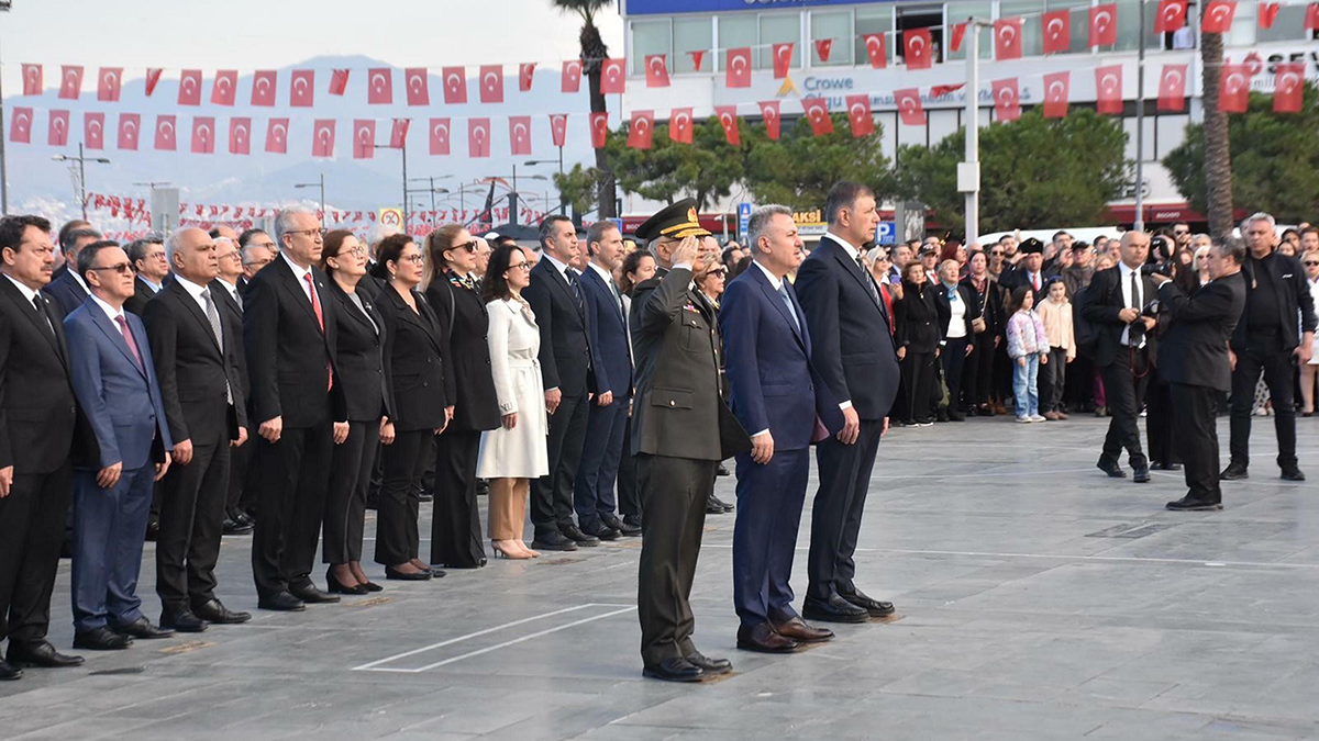 Türkiye Cumhuriyeti’nin kurucusu Ulu Önder Gazi Mustafa Kemal Atatürk’ün ölümünün 87’nci yıl dönümünde İzmir’de, çelenk töreni düzenlendi. Törende Cumhuriyet Meydanı’ndaki Atatürk Anıtı’na İzmir Valiliği, Garnizon Komutanlığı ve İzmir Büyükşehir Belediyesi’ne ait çelenkler konuldu. Törene, İzmir Valisi Süleyman Elban, Ege Ordusu ve Garnizon Komutanı Orgeneral İrfan Özsert, İzmir Büyükşehir Belediye Başkanı Cemil Tugay, milletvekilleri, STK ve oda temsilcileri ve kent protokolü katıldı. Törende, Gazi Mustafa Kemal Atatürk’ün bazı sözlerinin okunmasının ardından saat 09.05’te 2 dakikalık saygı duruşunda bulunuldu. İstiklal Marşı eşliğinde Türk bayrağının göndere çekilip, yarıya indirilmesinin ardından tören sona erdi.