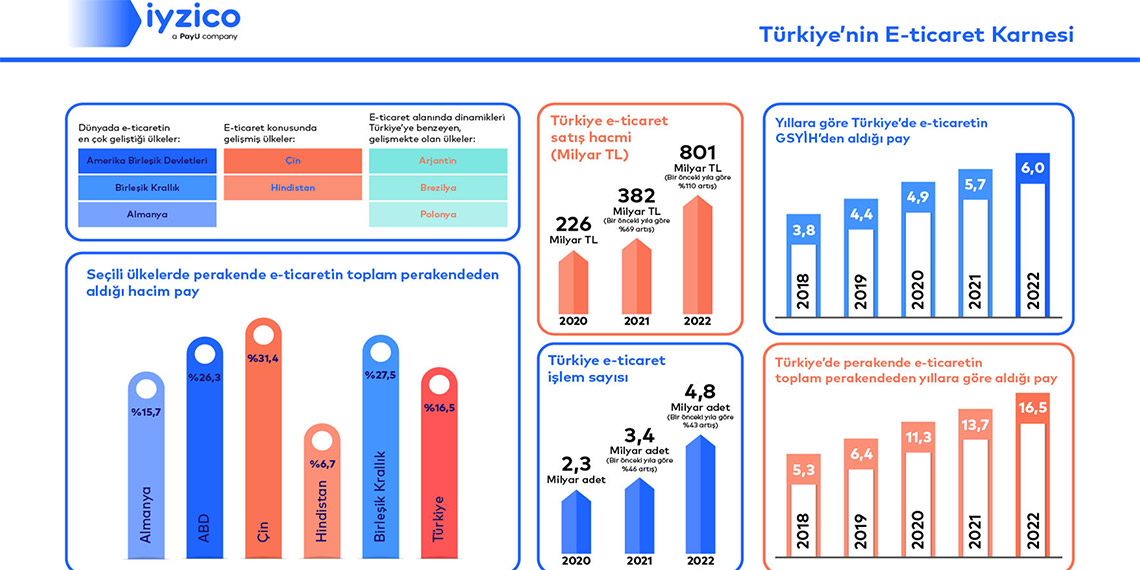 Bugün açıklanan Türkiye E-Ticaret Ekosistemi Raporu’na göre Türkiye’deki e-ticaret sektörü bir önceki yıla göre yüzde 110 artış göstererek 801 milyar lira satış hacmine ulaştı. Yıllara göre Türkiye’de e-ticaretin 2022’de Gayrisafi Yurt İçi Hasıla’dan (GSYİH) aldığı pay yüzde 6 oldu. Ayrıca e-ticaret işlem sayıları 2020 yılındaki değerinin 2 kat üzerine çıkarak 4.8 milyar adede yükseldi.