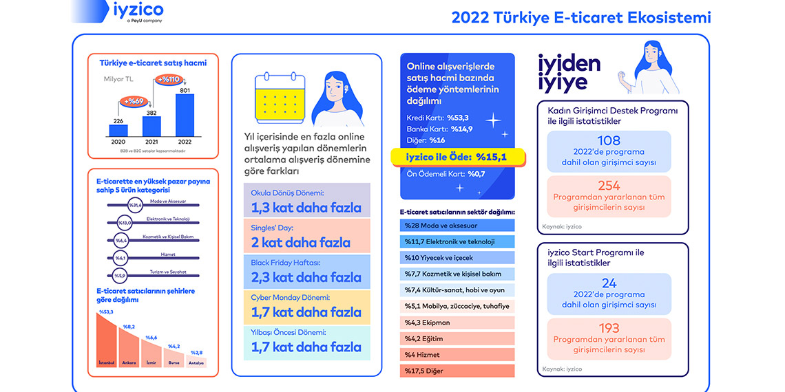 iyzico, Dogma Alares ve Elektronik Ticaret İşletmecileri Derneği (ETİD) iş birliğiyle hazırladığı ‘2022 Türkiye E-Ticaret Ekosistemi Raporu’nun sonuçlarını açıkladı. Rapora göre Türkiye’deki e-ticaret hacmi ve işlem sayıları her yıl büyümeye devam ediyor. Halihazırda dünyadaki 18’inci büyük e-ticaret pazarına ev sahipliği yapan Türkiye, yerel ölçekte olduğu kadar uluslararası arenada da etkileyici bir yükseliş trendi içerisinde bulunuyor.