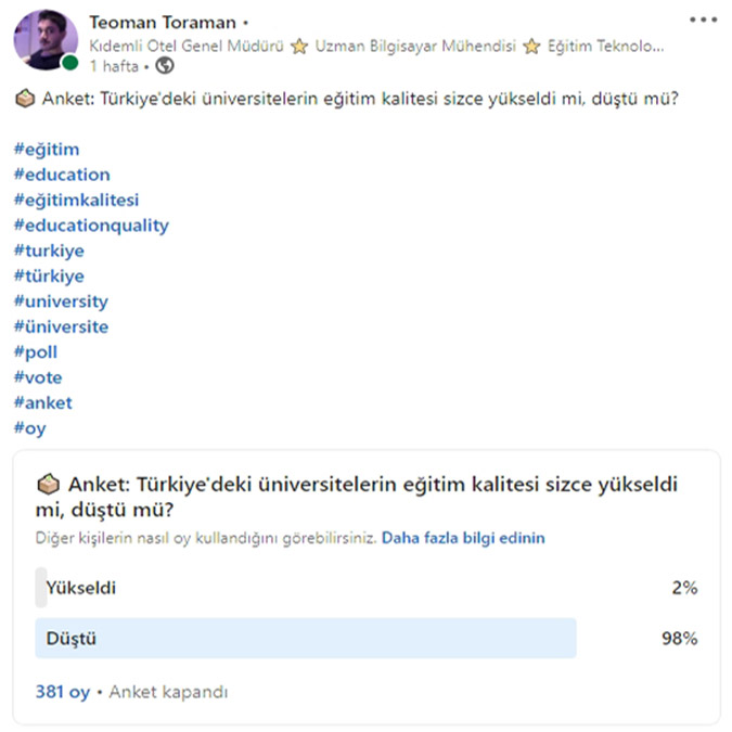 Linkedin platformunda 10009 gösterimli, 381 kişinin katıldığı anketimizde “Türkiye’deki üniversitelerin eğitim kalitesi sizce yükseldi mi, düştü mü?” sorusu soruldu.