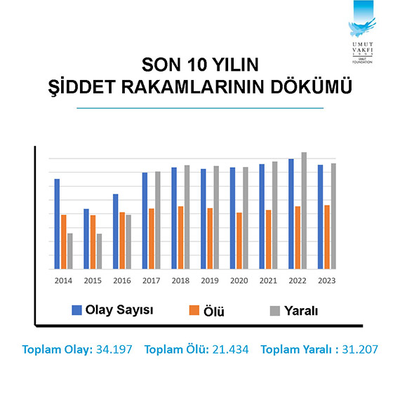 Umut Vakfı’nın 2014 yılından itibaren yayımladığı ‘Türkiye Silahlı Şiddet Haritası’ raporunu açıkladı. 2014 yılından bugüne geçen 10 yılda; toplam 34 bin 197 silahlı şiddet olayı yaşandı. 10 yılda meydana gelen 34 bin 197 silahlı şiddet olayında toplam 21 bin 434 kişi öldü, bazıları ağır 31 bin 207 kişi de yaralandı. 2023 yılında olayların en çok yaşandığı ilk 11 il ise sırasıyla; İstanbul, Samsun, Adana, İzmir, Kocaeli, Sakarya, Bursa, Şanlıurfa, Ankara, Diyarbakır ve Çorum şeklinde oldu.