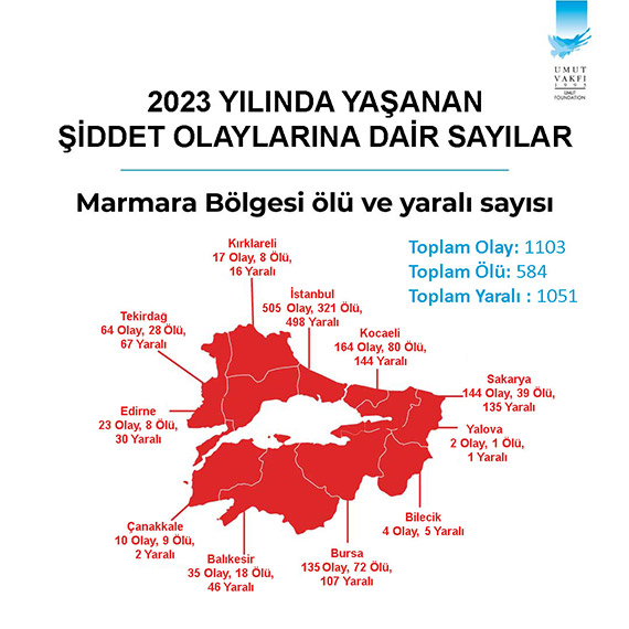 2023 yılında yaşanan silahlı şiddete bölgeler bazında bakıldığında; nüfus yoğunluğunun yaşandığı Marmara Bölgesi’ndeki 11 ilde yaşanan ve basına yansıyan toplam bin 103 olayda, 584 kişi öldürüldü, bin 51 kişi de yaralandı. İstanbul 505 olayla en çok olayın yaşandığı kent oldu. Basına yansıyan bu 505 şiddet olayında 321 kişi öldü, 498 kişi de yaralandı. İstanbul’u 80 kişinin öldüğü, 144 kişinin yaralandığı 164 olayla sanayi kenti Kocaeli, 144 olayla Sakarya, 135 olayla Bursa izliyor.