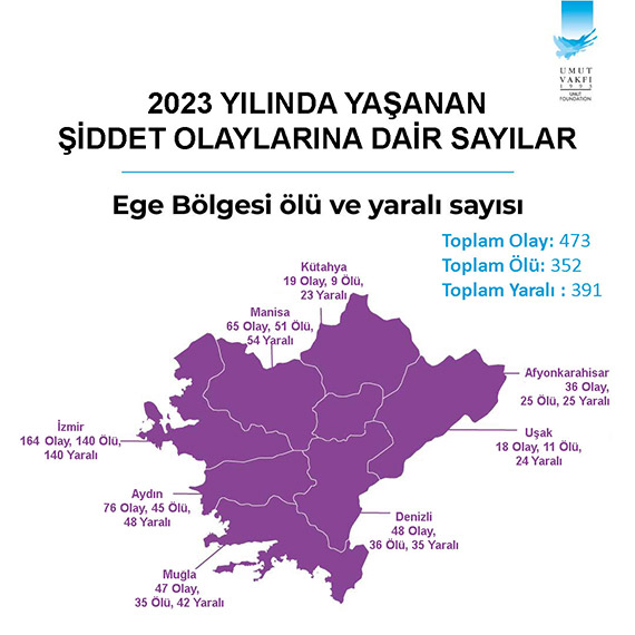 Karadeniz gibi Ege bölgesi de silahlı şiddet olaylarında 2023 yılında sıçrama yapan bölgelerden. Bir önceki yıl en çok silahlı şiddet olayı yaşanan bölgeler sıralamasında altıncı sırada olan Ege Bölgesi 2023’te dördüncü bölge durumunda.