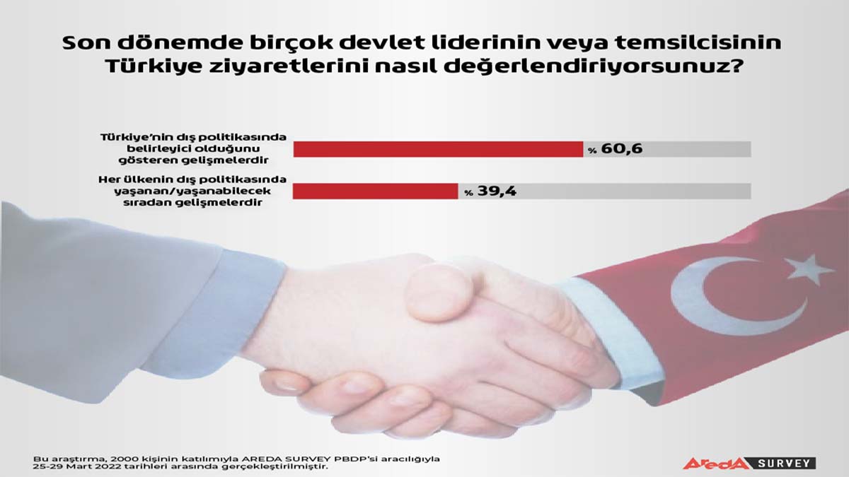 Rusya-Ukrayna savaşı başladığı günden itibaren Türkiye’nin çok sayıda devlet başkanının veya üst düzey yetkilinin uğrak yeri haline gelmesi konusuna ilişkin, katılımcılara yöneltilen ‘Son dönemde birçok devlet liderinin veya temsilcisinin Türkiye ziyaretlerini nasıl değerlendiriyorsunuz?’ sorusuna, yüzde 60,6’lık bir oranla “Türkiye’nin dış politikasında belirleyici güç olduğunu gösteren gelişmelerdir” yanıtı geldi. Bu durumu, her ülkenin dış politikasında yaşanan normal gelişme olarak görenlerin oranı yüzde 39,4 düzeyinde seyretti.