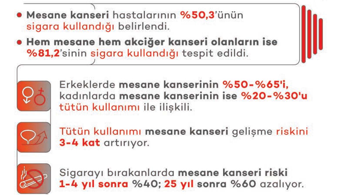 “Her yıl yeni tanı konulan mesane kanseri olgularının erkeklerde yüzde 50- 65’i, kadınlarda yüzde 20- 30’u tütün kullanımı ile ilişkili. Sigara ile ilişkili kansere bağlı ölümler sıralamasında mesane kanserine bağlı ölümler akciğer kanserinden sonra ikinci sırada yer alıyor. Sigaraya daha erken yaşlarda başlayanlarda mesane kanserinden ölüm riski daha yüksek. Mesane kanseri hastalarının daha ileri yaşlarda tanı alması, sigara kullanımına başlama ile mesane kanseri teşhisi arasında yaklaşık 30 yıllık bir gecikme süresi olduğunu düşündürüyor.