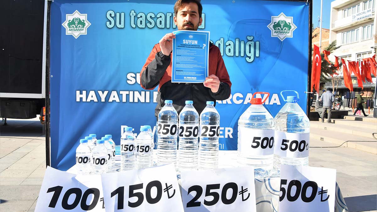 Aksaray Belediyesi’nin, iklim değişikliği ve bilinçsiz yapılan tarımsal sulama nedeniyle Tuz Gölü ile Mamasın Barajı’nda yaptığı araştırmada su seviyesinin azaldığı ortaya çıktı. Sonuçlara dikkat çekmek için düzenlenen etkinlikte, içinde su olan farklı litrelere sahip plastik şişelerin üzerine 100 liradan 500 liraya kadar fiyatlar yazıldı. Böylece gelecekte suyun yüksek fiyatlara satılmaması için tasarrufa dikkat çekildi.