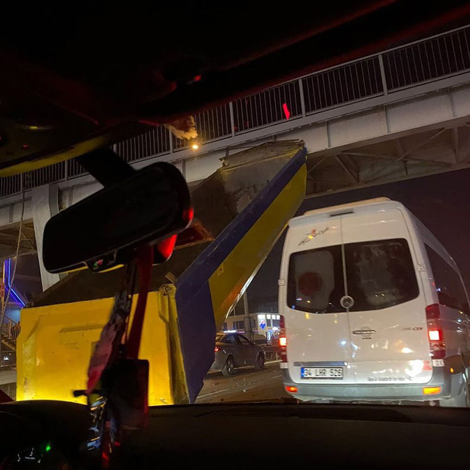 Çarpmanın etkisiyle damper üst geçide sıkışırken, hafriyat kamyonu yaklaşık 50 metre sonra durabildi. İhbar üzerine olay yerine polis ekipleri sevk edildi. Kazada ölen ya da yaralanan olmazken, kazanın olduğu istikamette trafik yoğunluğu oluştu.