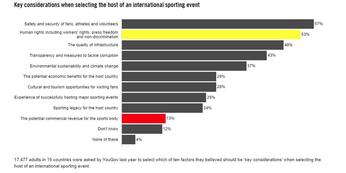Uluslararası Af Örgütü (AI) tarafından düzenlenen ankette yaklaşık 17 bin 500 kişiye, FIFA Dünya Kupası veya Olimpiyat Oyunları gibi uluslararası spor etkinlikleri için ev sahibi belirlerken, ‘hangi temel noktaların’ göz önünde bulundurulması gerektiği soruldu. Ankette, yüzde 57 oy alan ‘emniyet ve güvenlikten’ sonra, yüzde 53 oy ile ‘insan haklarının’ ev sahibi belirlemede en önemli faktör olarak düşünüldüğü görüldü.