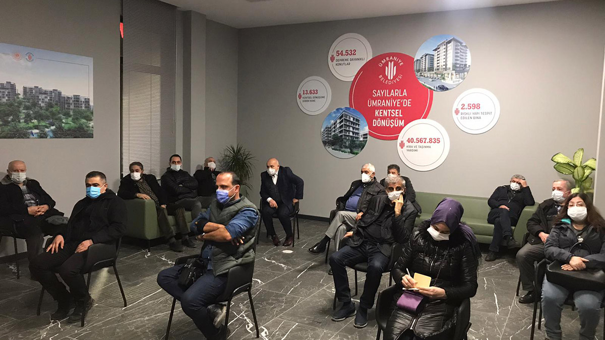 “Ümraniye’nin bazı mahallelerinde yaşanan kentsel dönüşüm sorunlarını çözmek için hizmete açılan Kentsel Dönüşüm Ofisi’nde uzman personel tarafından bilgilendirme toplantıları düzenleniyor. Kurulan bu ofis sayesinde vatandaşlar, doğrudan bilgilendirilip, ada/parsel bilgisi ile arsalarının imar durum bilgilerini öğreniyor. Vatandaşlar, mevzuata göre yararlanabileceği kentsel dönüşüm uygulamalarını buradan öğrenerek, kendisine en uygun olanı talep ediyor. Öte yandan riskli alan, rezerv yapı alanı, kentsel dönüşüm alanları ile uygulamadaki avantaj ve dezavantajları buradan öğreniyor. Arsalarıyla ilgili bilgilerini alan vatandaşlar, uygulama birliği içinde olacağı diğer parsel malikleri ile ofiste buluşarak ortak kararlar alarak değişime katkıda bulunuyor.”