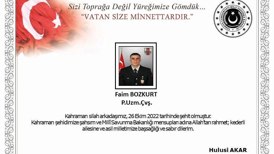 Milli Savunma Bakanı Hulusi Akar, Piyade Uzman Çavuş Faim Bozkurt için yayımladığı mesajda, “Kahraman silah arkadaşımız, 26 Ekim 2022 tarihinde şehit olmuştur. Kahraman şehidimize şahsım ve MSB mensupları adına Allah’tan rahmet; kederli ailesine ve asil milletimize başsağlığı ve sabır dilerim” ifadelerini kullandı.