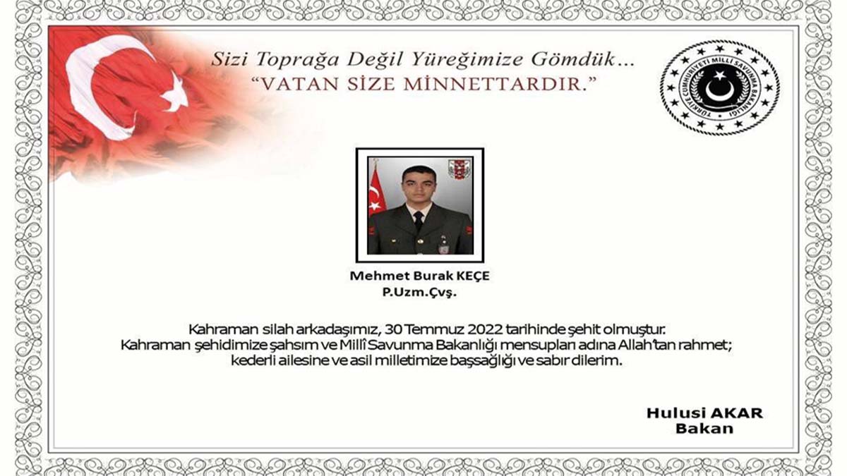 Milli Savunma Bakanı Hulusi Akar, şehit Mehmet Burak Keçe için taziye mesajı yayımladı. Akar, yayımladığı mesajında “Kahraman silah arkadaşımız, 30 Temmuz 2022 tarihinde şehit olmuştur. Kahraman şehidimize şahsım ve Milli Savunma Bakanlığı mensupları adına Allah’tan rahmet; kederli ailesine ve asil milletimize başsağlığı ve sabır dilerim” dedi.