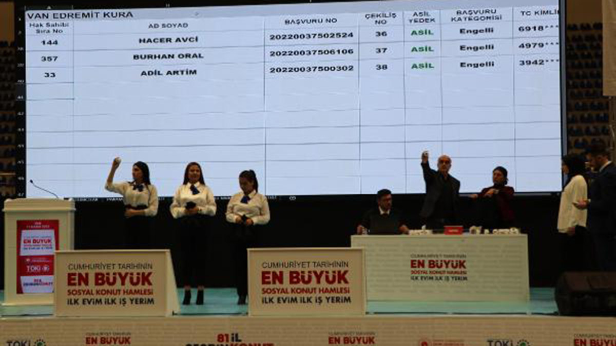 Çevre, Şehircilik ve İklim Değişikliği İl Müdürü Ali Kemal Atlı, Van’da 50 binin üzerinde başvuru yapıldığını belirterek, “Cumhuriyet tarihinin en büyük sosyal konut hamlesi ‘İlk Evim, İlk İş Yerim’ projesi kapsamında Van ilimizde yapılacak 3 bin 200 konutun hak sahibinin belirlenmesi için şu anda kura heyecanı devam ediyor. Toplamda 50 binin üzerinde başvuru var. Kuralar çekiliyor şu an. Gelemeyen vatandaşlarımız TOKİ tarafından yapılan canlı yayınlarla da takip edebiliyor. Kura çekimleri Van’da 3 gün sürecek” dedi.