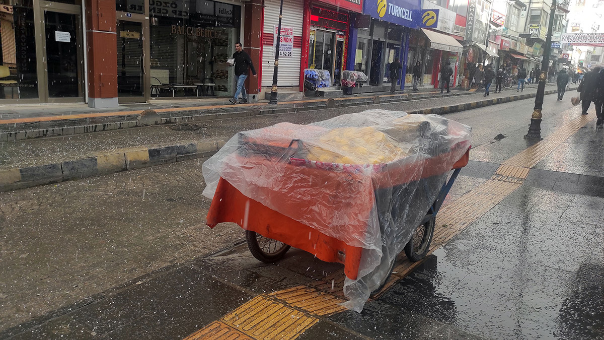 Van’da dolu yağışı etkili olurken, hazırlıksız yakalananlar binaların saçakları altına girdi.