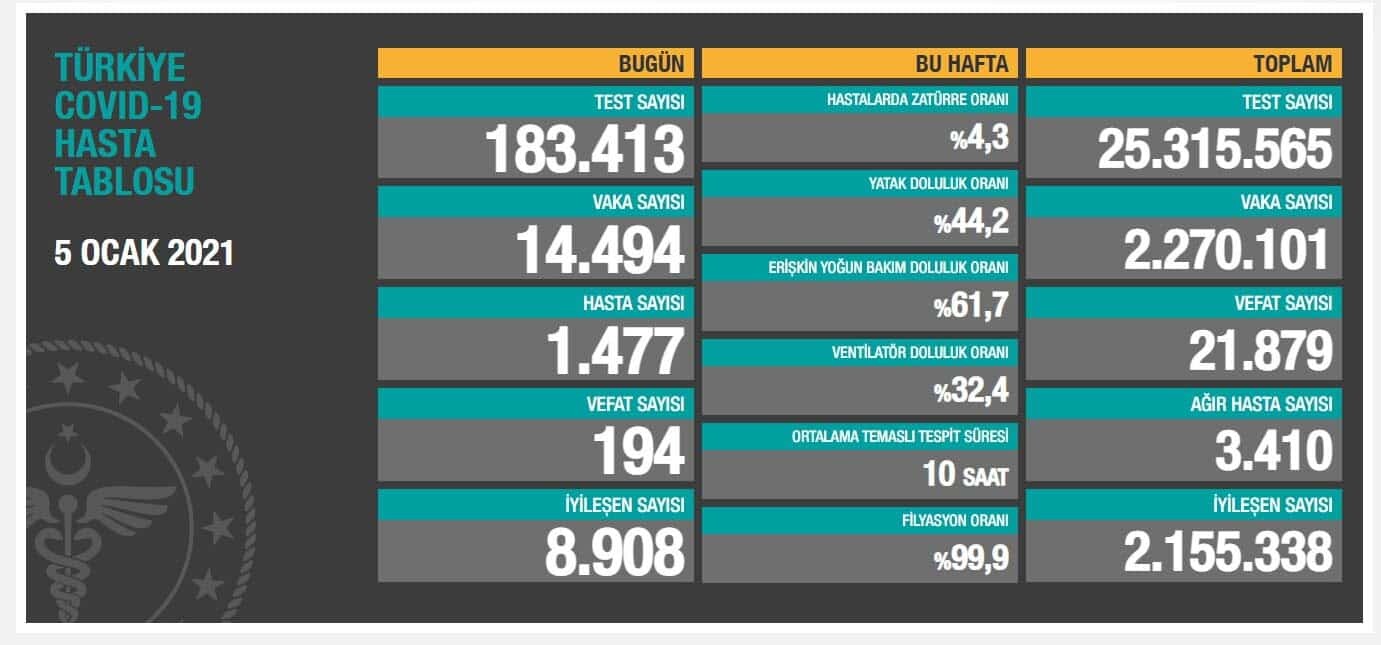 Sağlık Bakanlığı’nca duyurulan güncel ‘Türkiye Covid- 19 Hasta Tablosu’na göre; son 24 saatte yapılan 183 bin 413 testte, 14 bin 494 vaka ile 1477 koronavirüs hastası tespit edildi. Virüs nedeniyle 194 kişi hayatını kaybederken, 8 bin 908 kişi de iyileşti. Bugünkü verilerle, toplam test sayısı 25 milyon 315 bin 565, toplam vaka sayısı 2 milyon 270 bin 101, toplam vefat sayısı 21 bin 879, toplam ağır hasta sayısı 3 bin 410, toplam iyileşen hasta sayısı 2 milyon 155 bin 338 oldu.