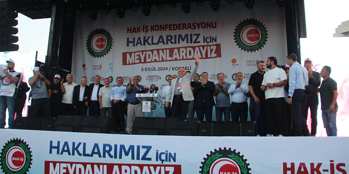 HAK İşçi Sendikaları Konfederasyonu (HAK-İŞ), ‘Halklarımız İçin Meydanlardayız’ mitinginin 2’ncisini Kocaeli’de gerçekleştirdi. Mitingde konuşan Genel Başkan Mahmut Arslan, yeni vergi düzenlemesiyle ilgili, “Vergilerle ilgili bir düzenleme yapıldı. Bazı işverenlerden yeni vergiler talep edildi. Hiç vergi vermeyenlere dokunmaya başladılar. Hemen kıyameti kopardılar. Hemen ‘Maliye Bakanı istifa etti’ diye yalanlar uydurdular. Neden biliyor musunuz? Vergi vermemeye alışmış bunlar; vergi vermek istemiyorlar. Karlarına kar katacaklar, bitmek tükenmek bilmeyen kar hırsları devam ediyor. Onun için biz diyoruz ki çok kazanan çok vergi versin, az kazanan da az vergi versin” dedi.