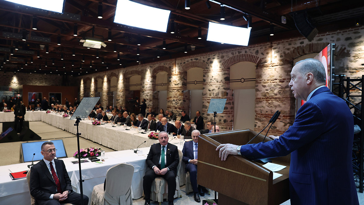 Konuşmasının devamında Cumhurbaşkanı Erdoğan, “Bugünkü toplantımızın gayesi ülkemizi Türkiye ulusal risk kalkanı modeli olarak tasavvur ettiğimiz işte böyle bir perspektife kavuşturacak sürecin fikri zeminini oluşturmaktır. Bu yaklaşımı oluştururken Türkiye’nin karşı karşıya bulunduğu afet kavramı altında toplanabilecek tüm tehlike ve tehditleri birlikte değerlendirmeliyiz. Deprem bunlardan biridir. Aynı şekilde sel, yangın, heyelan, kuraklık gibi diğer doğal afetleri de buna eklemeliyiz. Yetmez ayrıca salgın hastalıktan teröre, sığınmacı akınlarından ekonomik krizlere, diğer unsurları da buna ilave etmeliyiz.