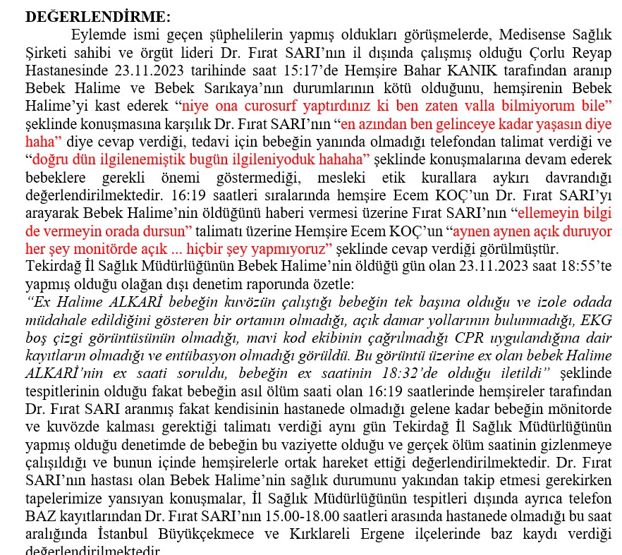 İddianamede, özel hastanelerden birinde hemşire olarak görev yapan şüpheli Mehtap S. ile örgüt üyesi şüpheli Hasan Basri G. arasında yapılan görüşmede, Hasan Basri G.’nin “Mehtap çocuğu öldür, 50 satürasyonlu çocuk mu olur” dediği, hemşire Mehtap S.’nin ise “Öldüreceğim de öldürsem de bir dert biliyorsun yani” dediği anlaşıldı.