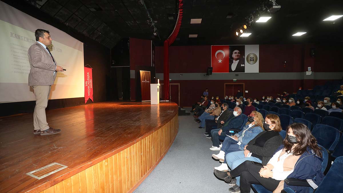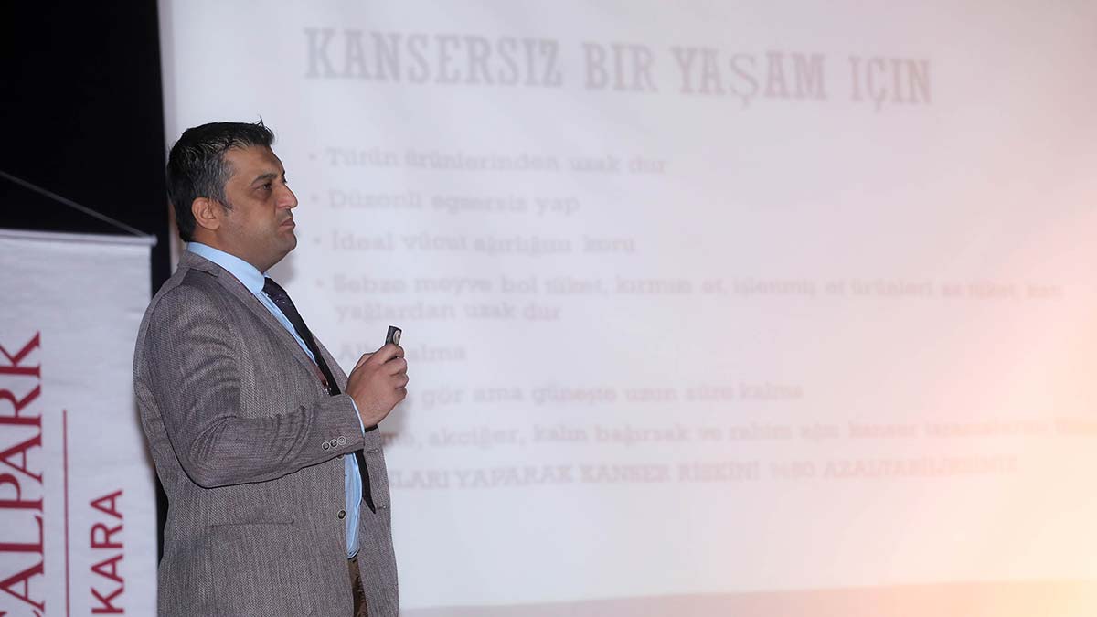 Batıkent Meydan AVM Sinan Bengier Tiyatro Salonu’nda gerçekleştirilen seminerde Prof. Dr. Burak Civelek kanser nedir, kanser oluşumunda aile ve çevresel etmenler nelerdir, kanserden korunmanın yolları, aşırı kilo alımı ve kanser, fiziksel aktivite yetersizliğinin kanser oluşumuna etkileri, beslenme alışkanlıkları gibi birbirinden farklı ana başlıkları masaya yatırdı.