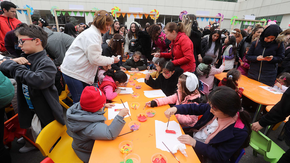 Bahar Yüzlü Çocuk Şenliği’nde taş boyama, yüz boyama, seramik boyama, çanta boyama, kum boyama, çim adam yapımı, kitap ayracı ve masal atölyesi gibi birbirinden renkli ve eğitici stantlar minik sakinler için kuruldu.