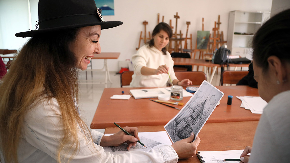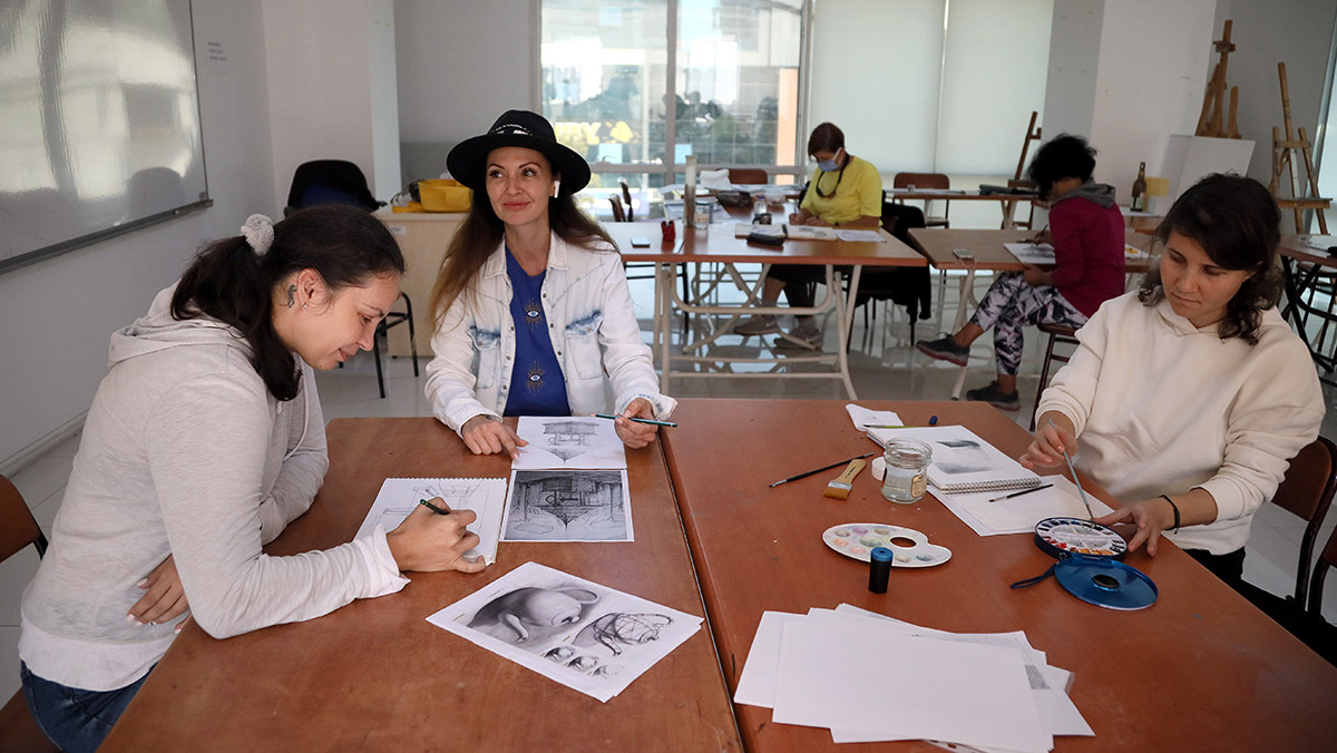 İl Milli Eğitim Müdürlüğü ile Antalya Büyükşehir Belediyesi arasında yapılan proje kapsamında Atatürk Sanat Eğitim Merkezi’nde haftanın 5 günü düzenlenen kurslara katılan yerleşik yabancı kadınlar, birlikte zaman geçirip, yağlı boya, sulu boya ve kara kalem resim eğitimi alıyor.