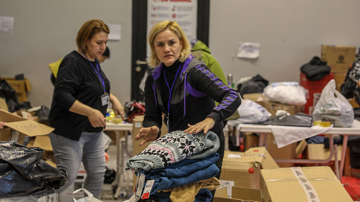 Antalya’da deprem bölgesine gidecek yardımların toplandığı alanda turistler ve yerleşik yaşayan yabancılar da var gücüyle çalışıyor.
