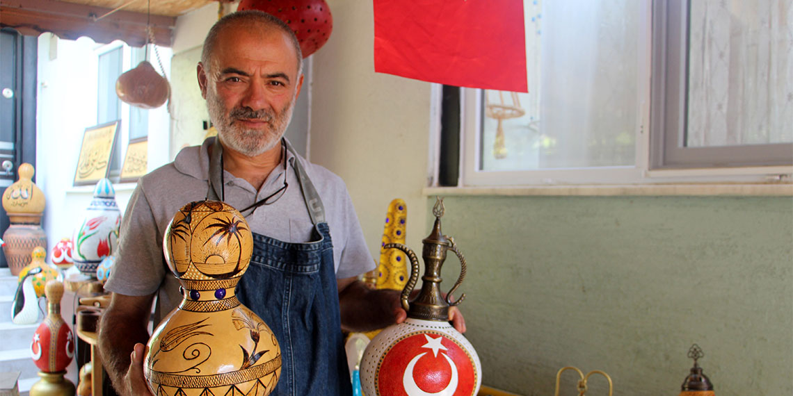 Isparta’da emekli öğretmen Hasan Bakan’ın (58) evinin bahçesinde yetiştirdiği su kabaklarını dekoratif ürünlere çeviriyor.