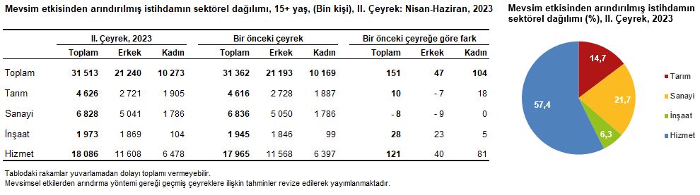 Mevsim etkisinden arındırılmış istihdam edilenlerin sayısı 2023 yılı II. çeyreğinde bir önceki çeyreğe göre sanayi sektöründe 8 bin kişi azalırken, tarım sektöründe 10 bin kişi, inşaat sektöründe 28 bin kişi, hizmet sektöründe 121 bin kişi arttı. İstihdam edilenlerin %14,7’si tarım, %21,7’si sanayi, %6,3’ü inşaat, %57,4’ü ise hizmet sektöründe yer aldı.
