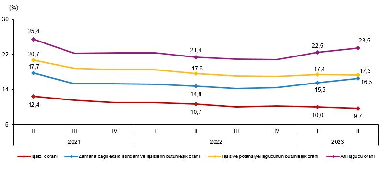 Zamana bağlı eksik istihdam, potansiyel işgücü ve işsizlerden oluşan atıl işgücü oranı 2023 yılı II. çeyreğinde bir önceki çeyreğe göre 1 puanlık artış ile %23,5 oldu. Zamana bağlı eksik istihdam ve işsizlerin bütünleşik oranı %16,5 iken potansiyel işgücü ve işsizlerin bütünleşik oranı %17,3 olarak tahmin edildi.