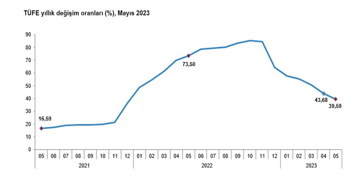TÜİK, Mayıs 2023 dönemine ilişkin enflasyon verilerini açıkladı. Buna göre; tüketici enflasyonuna işaret eden tüketici fiyat endeksindeki (TÜFE) değişim, mayıs ayında bir önceki aya göre yüzde 0,04, bir önceki yılın aralık ayına göre yüzde 15,26, bir önceki yılın aynı ayına göre yüzde 39,59 ve 12 aylık ortalamalara göre yüzde 63,72 olarak gerçekleşti.