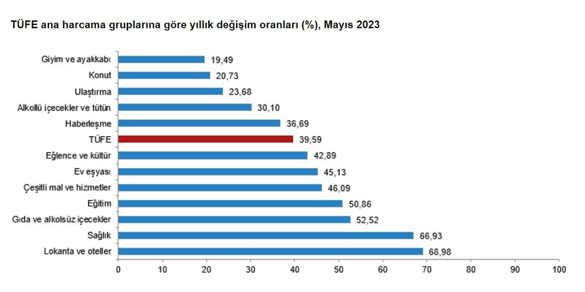 Bir önceki yılın aynı ayına göre en az artış gösteren ana grup yüzde 19,49 ile giyim ve ayakkabı oldu. Buna karşılık, bir önceki yılın aynı ayına göre artışın en yüksek olduğu ana grup ise yüzde 68,98 ile lokanta ve oteller oldu. Ana harcama grupları itibarıyla mayıs ayında bir önceki aya göre en az artış gösteren ana grup yüzde eksi 13,79 ile konut oldu. Bir önceki aya göre artışın en yüksek olduğu ana grup ise yüzde 9,85 ile giyim ve ayakkabı oldu.