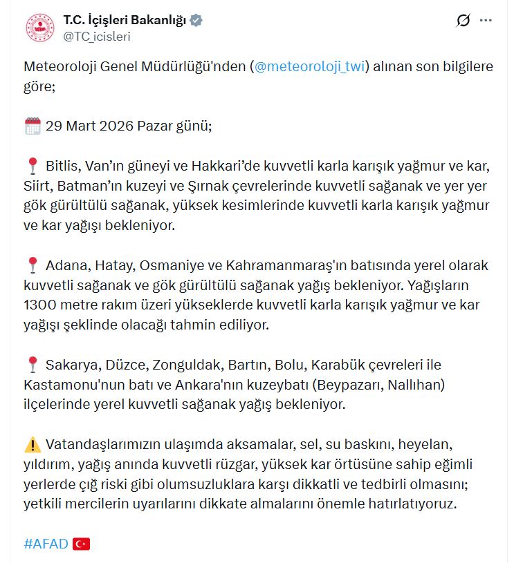 Bakanlığın sanal medya hesabından yapılan açıklamada, "Meteoroloji Genel Müdürlüğü'nden alınan son bilgilere göre; 29 Mart 2026 Pazar günü; Bitlis, Van'ın güneyi ve Hakkari'de kuvvetli karla karışık yağmur ve kar, Siirt, Batman'ın kuzeyi ve Şırnak çevrelerinde kuvvetli sağanak ve yer yer gök gürültülü sağanak, yüksek kesimlerinde kuvvetli karla karışık yağmur ve kar yağışı bekleniyor. Adana, Hatay, Osmaniye ve Kahramanmaraş'ın batısında yerel olarak kuvvetli sağanak ve gök gürültülü sağanak yağış bekleniyor. Yağışların 1300 metre rakım üzeri yükseklerde kuvvetli karla karışık yağmur ve kar yağışı şeklinde olacağı tahmin ediliyor" denildi.
