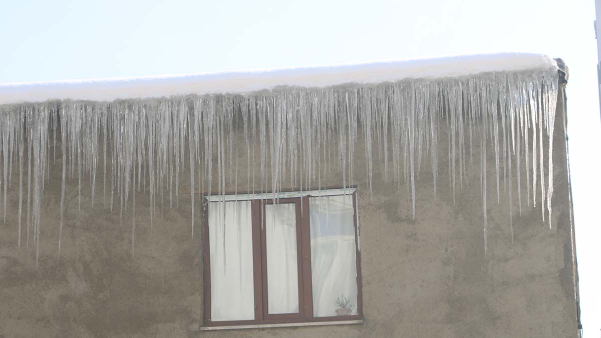 Hakkari’nin Yüksekova ilçesinde etkili olan soğuk hava nedeniyle dereler buz tuttu, binaların çatılarında uzun sarkıtlar oluştu