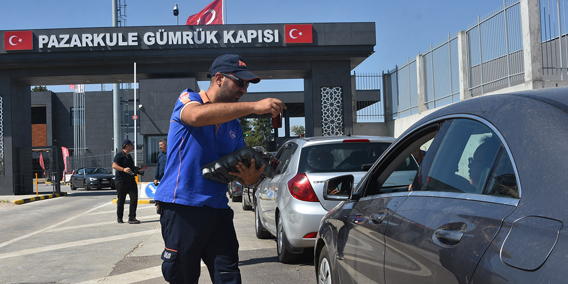 Hava sıcaklığının 35 derece ölçüldüğü Edirne’de, AFAD Edirne İl Müdürlüğü ekipleri, kuyrukta araçlarıyla çıkış için bekleyenlere, soğuk şerbet ve su dağıtımı yaptı.