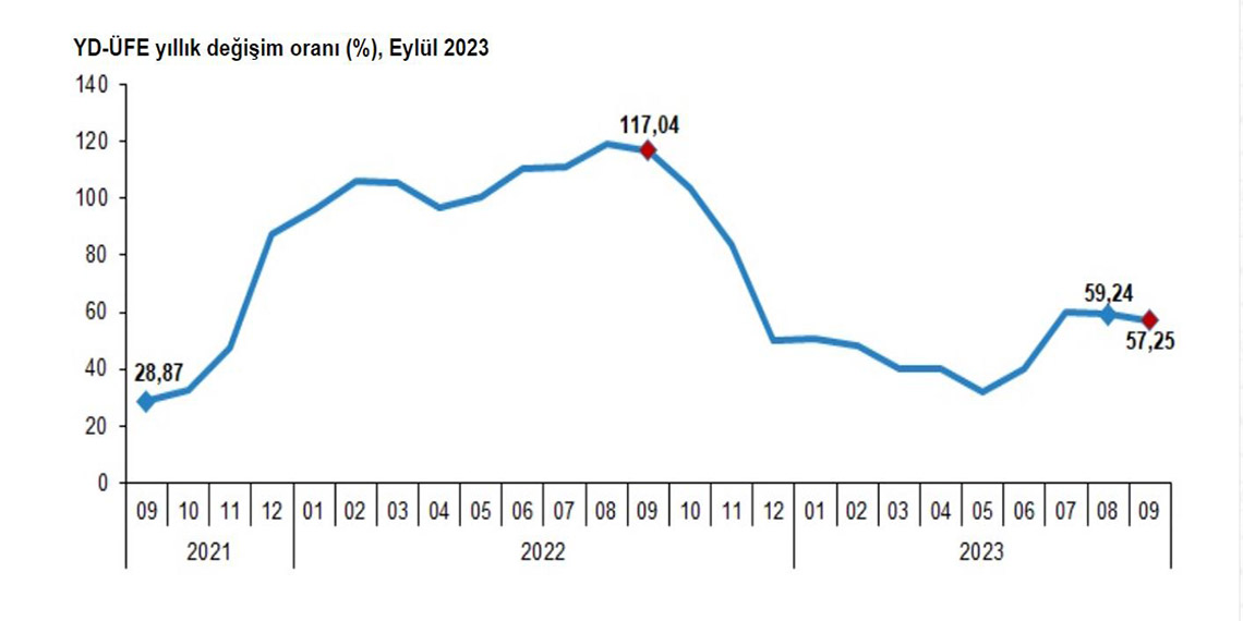 Türkiye İstatistik Kurumu (TÜİK) duyurdu; Yurt dışı üretici enflasyonu eylülde aylık yüzde 0,59 azaldı ve yıllık yüzde 57,25 oldu.