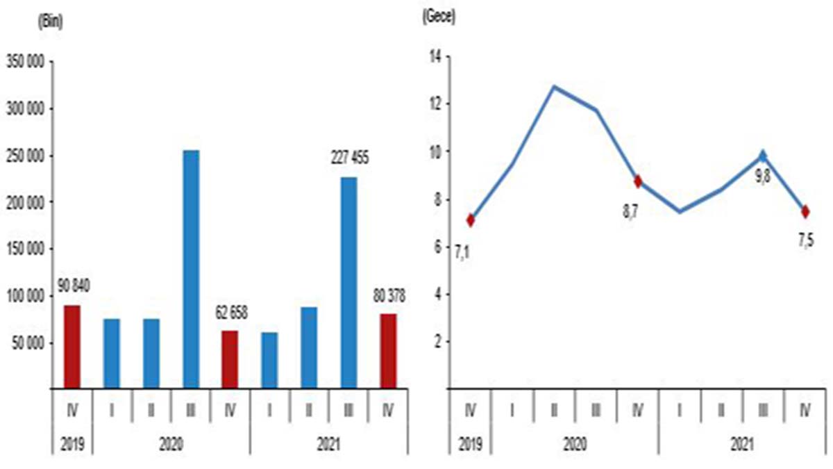Bu çeyrekte seyahate çıkanlar 80 milyon 378 bin geceleme yaptı. Ortalama geceleme sayısı 7,5 gece oldu. Yıllık olarak değerlendirildiğinde, toplam seyahat sayısı bir önceki yıla göre yüzde 23,2 artarak, 52 milyon 774 bin olarak gerçekleşti. Bu yılda seyahate çıkanların yaptıkları toplam geceleme sayısı bir önceki yıla göre yüzde 2,2 azalarak, 458 milyon 872 bin olarak gerçekleşti. Ortalama geceleme sayısı 2021 yılında 8,7 gece oldu.