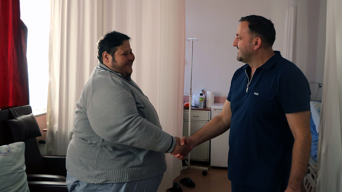 Hastayı öncelikle 5-10 kilo arasında kilo verdirttik daha sonra ameliyat kararı aldık. İlk etapta tüp mide yaptık. Ameliyat sonrası ertesi gün hastamız su içmeye, 3 gün sonra da yürüme ve egzersiz hareketlerine başladı. Taburcu aşamasına geldi.