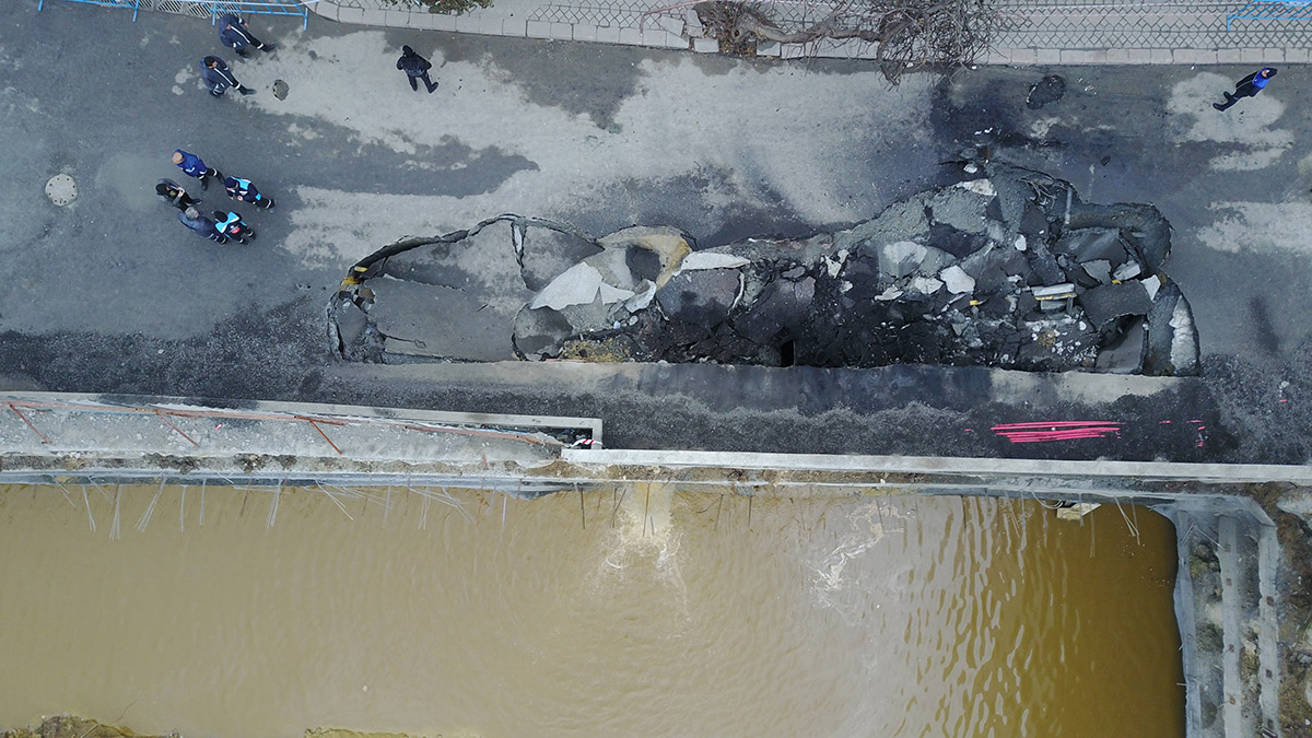 Zeytinburnu’nda çöken yol havadan görüntülendi. Polis ve zabıta ekipleri olay yerinde barikat ile güvenlik önlemleri aldı.