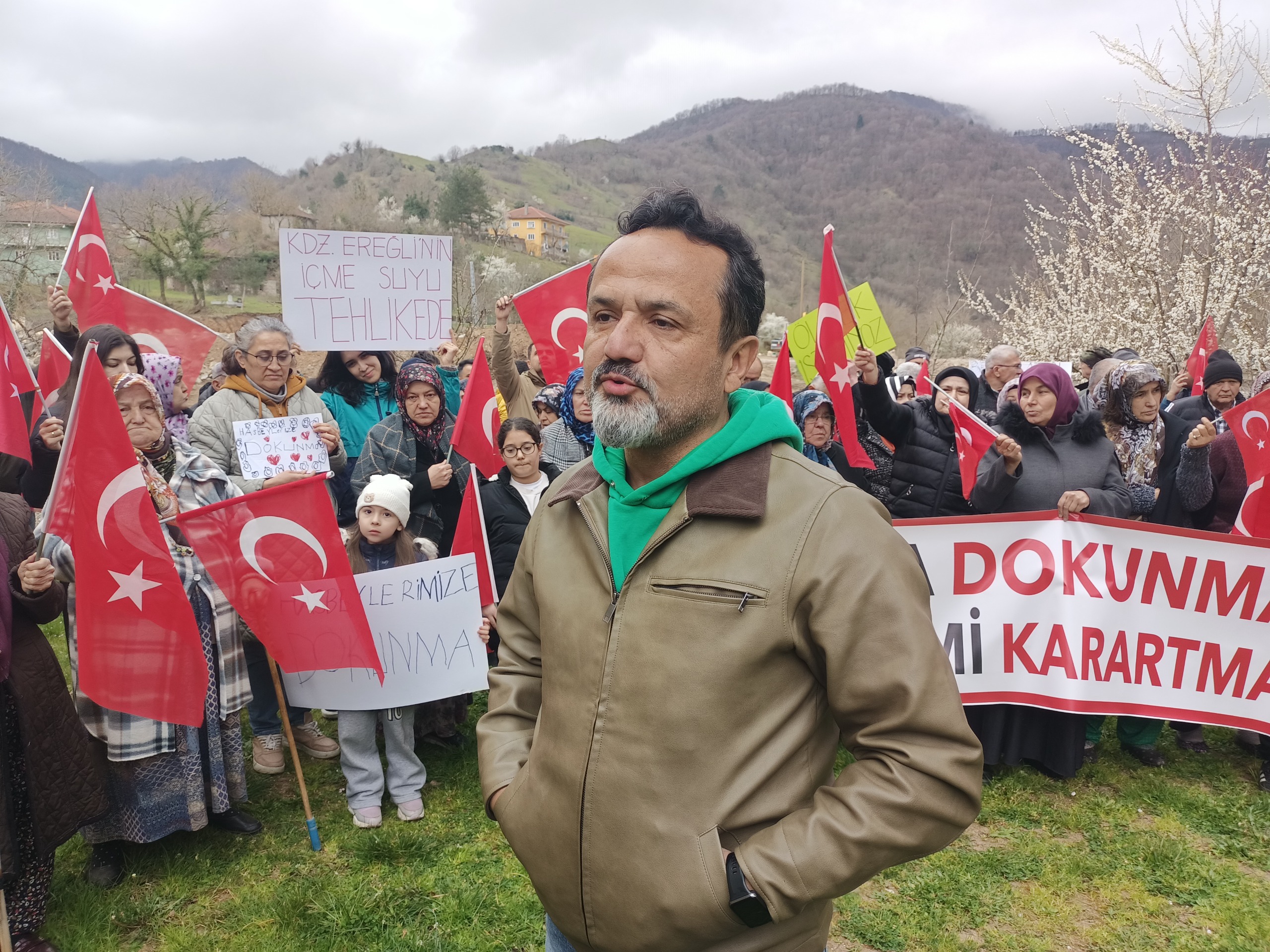 Ereğli’nin içme suyunun ve kendi köylerinin su kaynaklarının beton santraliyle beraber kirleneceğini söyleyen Hasbeyler Muhtarı Hasan Duman, “Arife ve bayram bana ve köylülerime zehir oldu. Yaklaşık 2 ay önce bir firma gelerek içme suyumuzun hemen yanına Ereğli ilçe merkezinin içme suyunu da besleyen deremizin adeta üzerine beton santrali kurulacağını söyledi. Bu santralin buraya kurulmasının mümkün olmadığını, burada içme suyumuzun olduğunu söyledik gitti. 2-3 gün önce burada makineler çalışmaya başladı, yetkili makamlardan izin alarak buraya beton santrali kurulacağını söylediler. Hakikaten şaşırdık kaldık. Biz köye dönüşü sağlamaya çalışırken bu yapılanları anlayamadık, hayal kırıklığına uğradık. Köyümüzde hayvancılık projesi yaptık ve bunda da başarılı olduk. Sadece bizim köyümüzü değil çevremizdeki 6 köyü de ilgilendiren bir arıcılık projesi arifesindeyiz. Bu proje kadınlarımıza yönelik ve 30 aileyi ilgilendiriyor. Bu beton santralinin hem içme suyumuzu hem de köyümüzdeki üretimi olumsuz etkileyeceği için bunun olmayacağını söylüyoruz ve bunda da kararlıyız. Köyümüzün adı Hasbeyler ama köyümüzün bir diğer adı bir yeryüzü cenneti. Her tarafta öyle biliniyor. Lütfen yetkililer aklını başına alsın, bu verdikleri kararı bir daha gözden geçirsinler. Hiçbir şey insan sağlığından önemli değildir.” dedi.